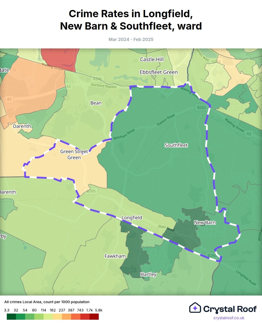 Longfield, New Barn & Southfleet, (ward) includes areas with the following crime ratings (see map):
