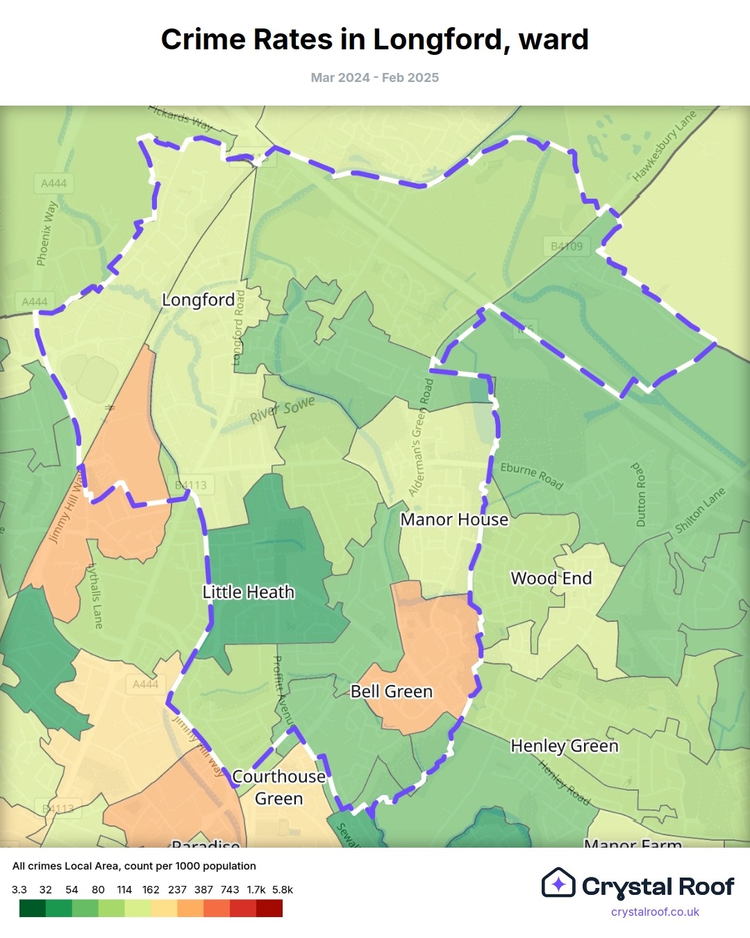 Longford, (ward) includes areas with the following crime ratings (see map):