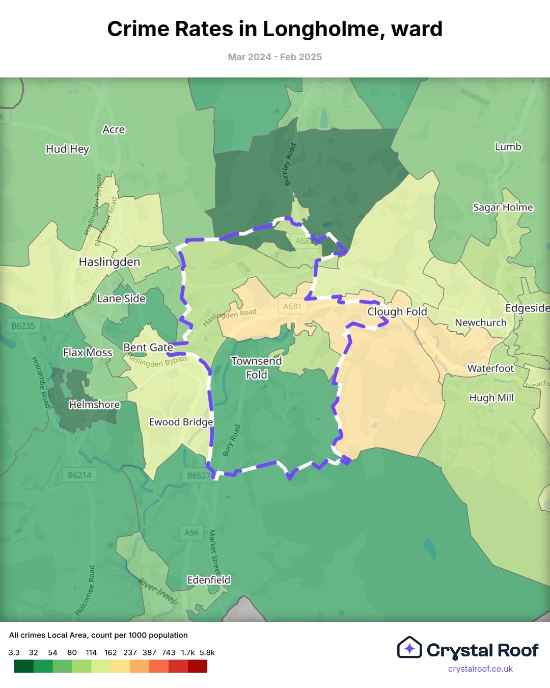 Longholme (ward) is located within Rossendale (borough). Annual total crime rate in Rossendale (borough) is 99.1 crimes per thousand resident population, which can be rated as 4 out of 10 or low crime level compared to other local authority districts in England and Wales.