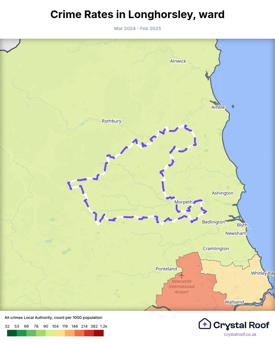 Longhorsley, (ward) includes areas with the following crime ratings (see map):