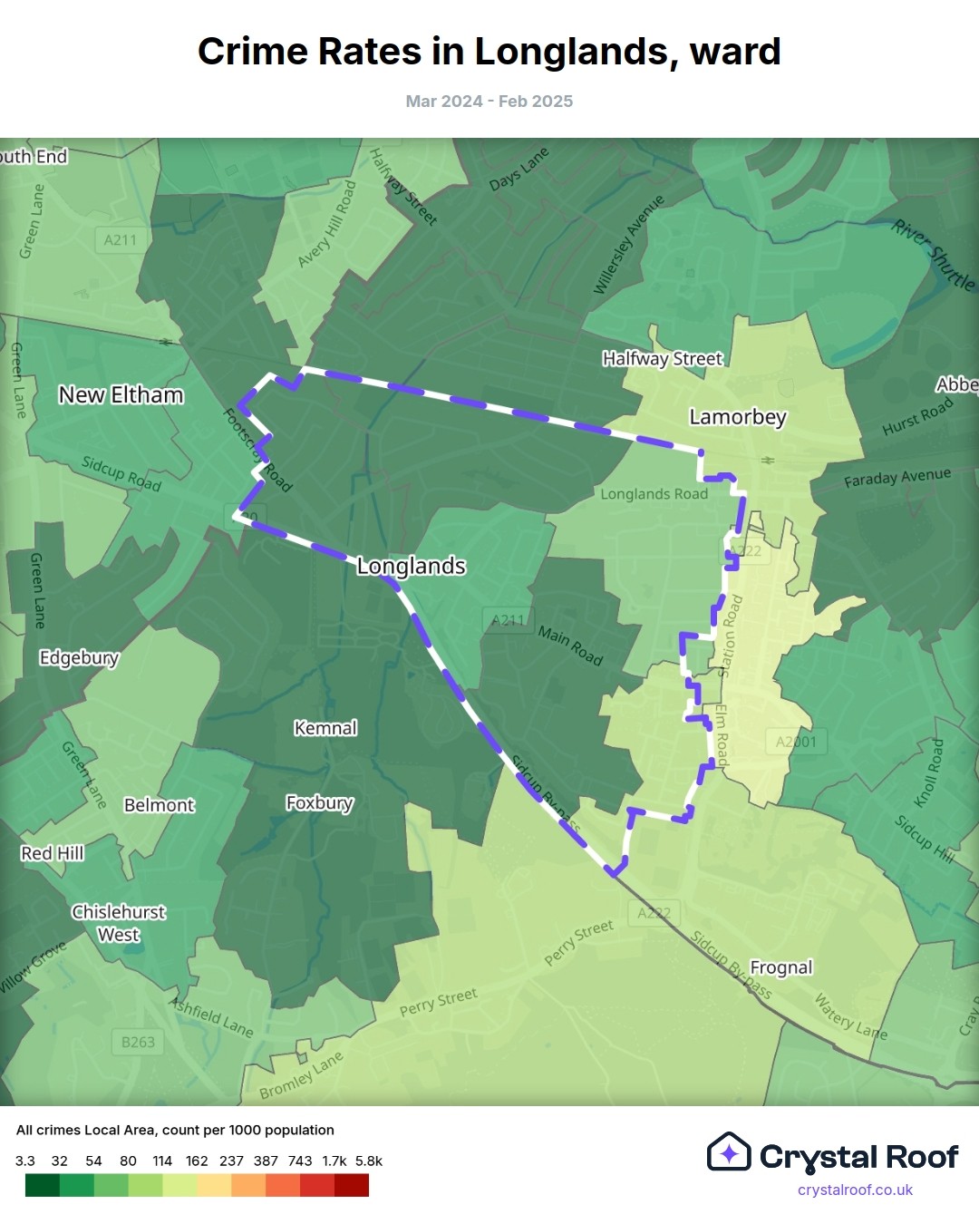 Longlands (ward) is located within Bexley (borough). Annual total crime rate in Bexley (borough) is 80.4 crimes per thousand resident population, which can be rated as 3 out of 10 or low crime level compared to other local authority districts in England and Wales.