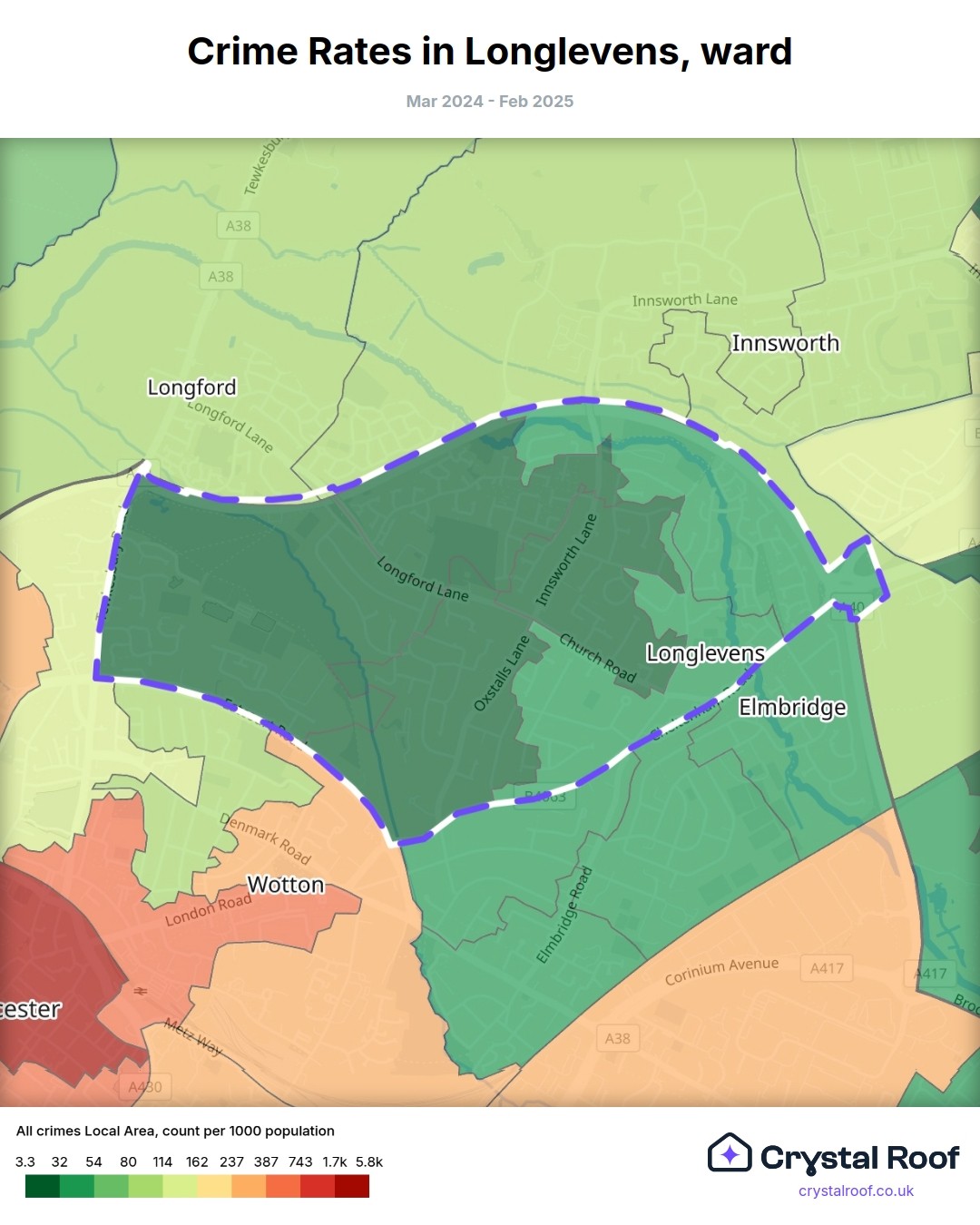 The figures in grey indicate the relative ratings of Longlevens (ward) for a specific crime type compared to other wards in England and Wales.