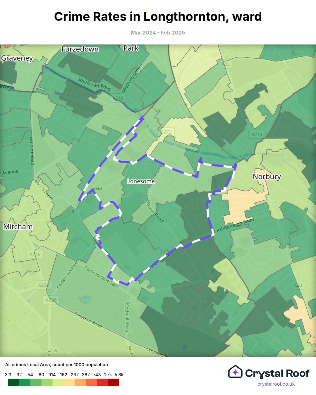 Longthornton (ward) is located within Merton (borough). Annual total crime rate in Merton (borough) is 79.7 crimes per thousand resident population, which can be rated as 3 out of 10 or low crime level compared to other local authority districts in England and Wales.