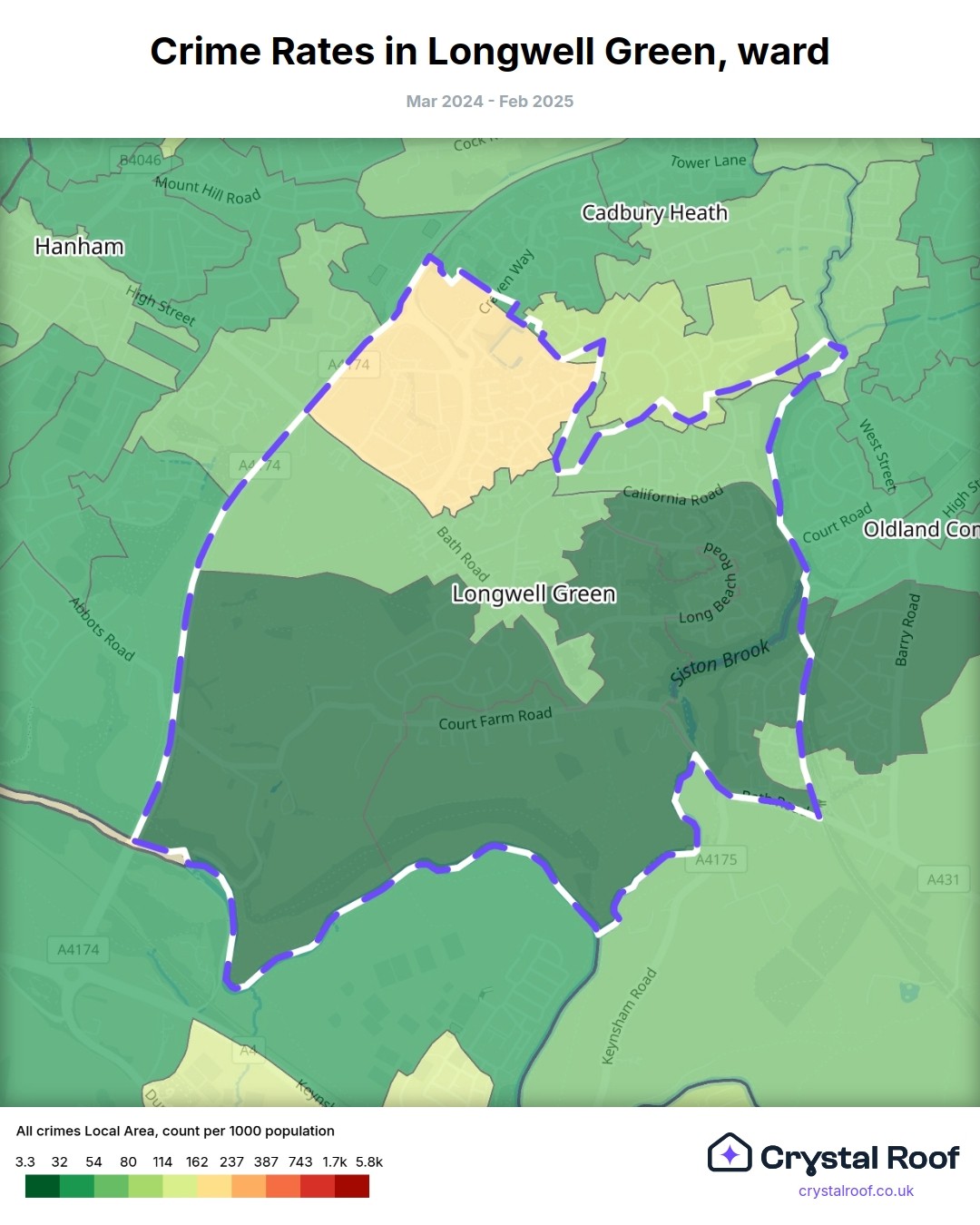 Longwell Green, (ward) includes areas with the following crime ratings (see map):