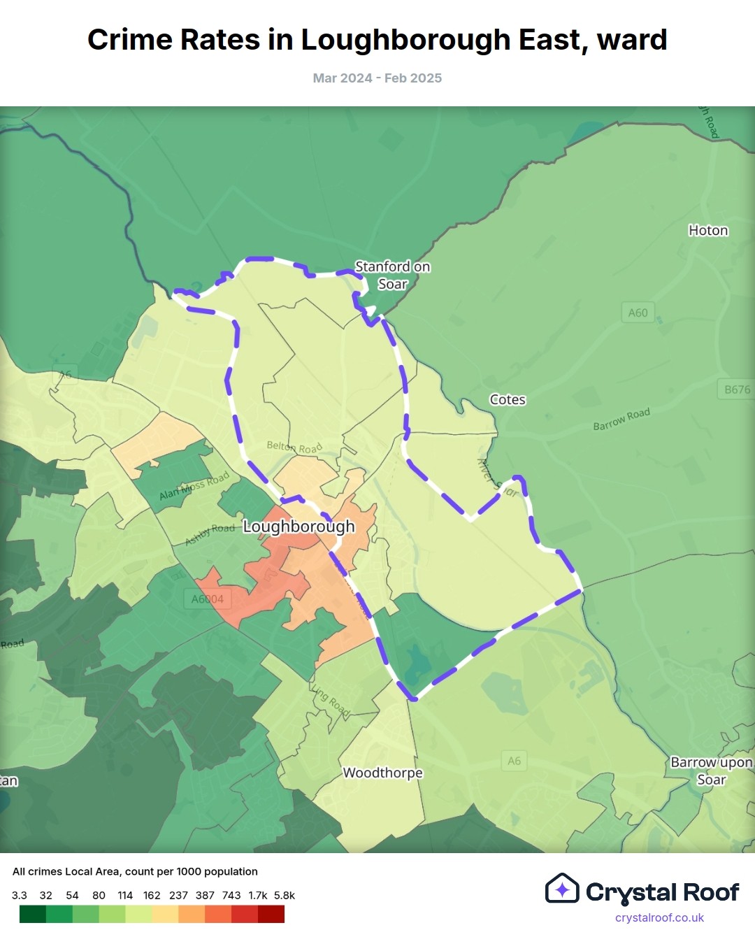 Loughborough East, (ward) includes areas with the following crime ratings (see map):