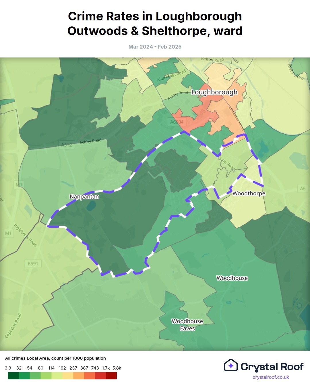 Loughborough Outwoods & Shelthorpe, (ward) includes areas with the following crime ratings (see map):