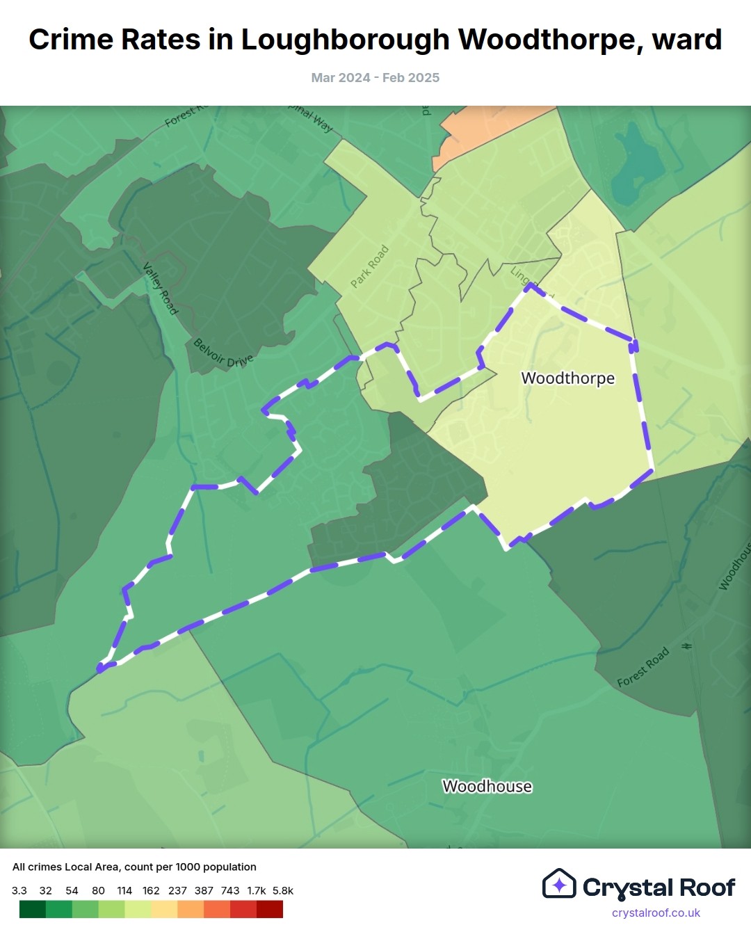 Loughborough Woodthorpe, (ward) includes areas with the following crime ratings (see map):