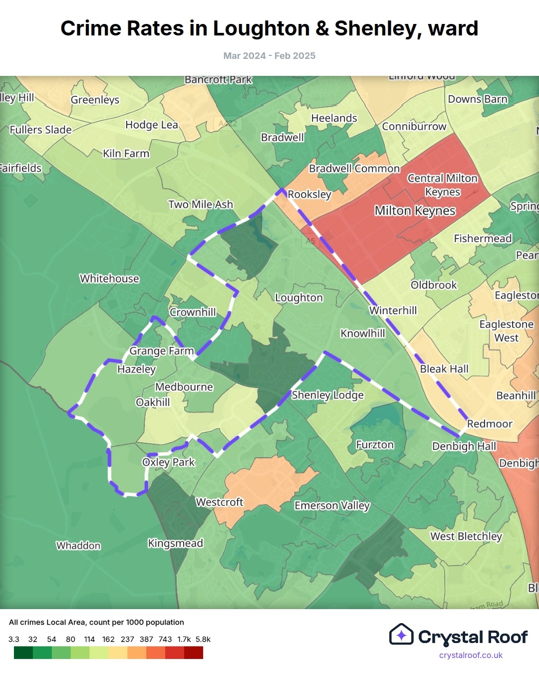 Loughton & Shenley (ward) is located within Milton Keynes (borough). Annual total crime rate in Milton Keynes (borough) is 107 crimes per thousand resident population, which can be rated as 5 out of 10 or medium crime level compared to other local authority districts in England and Wales.