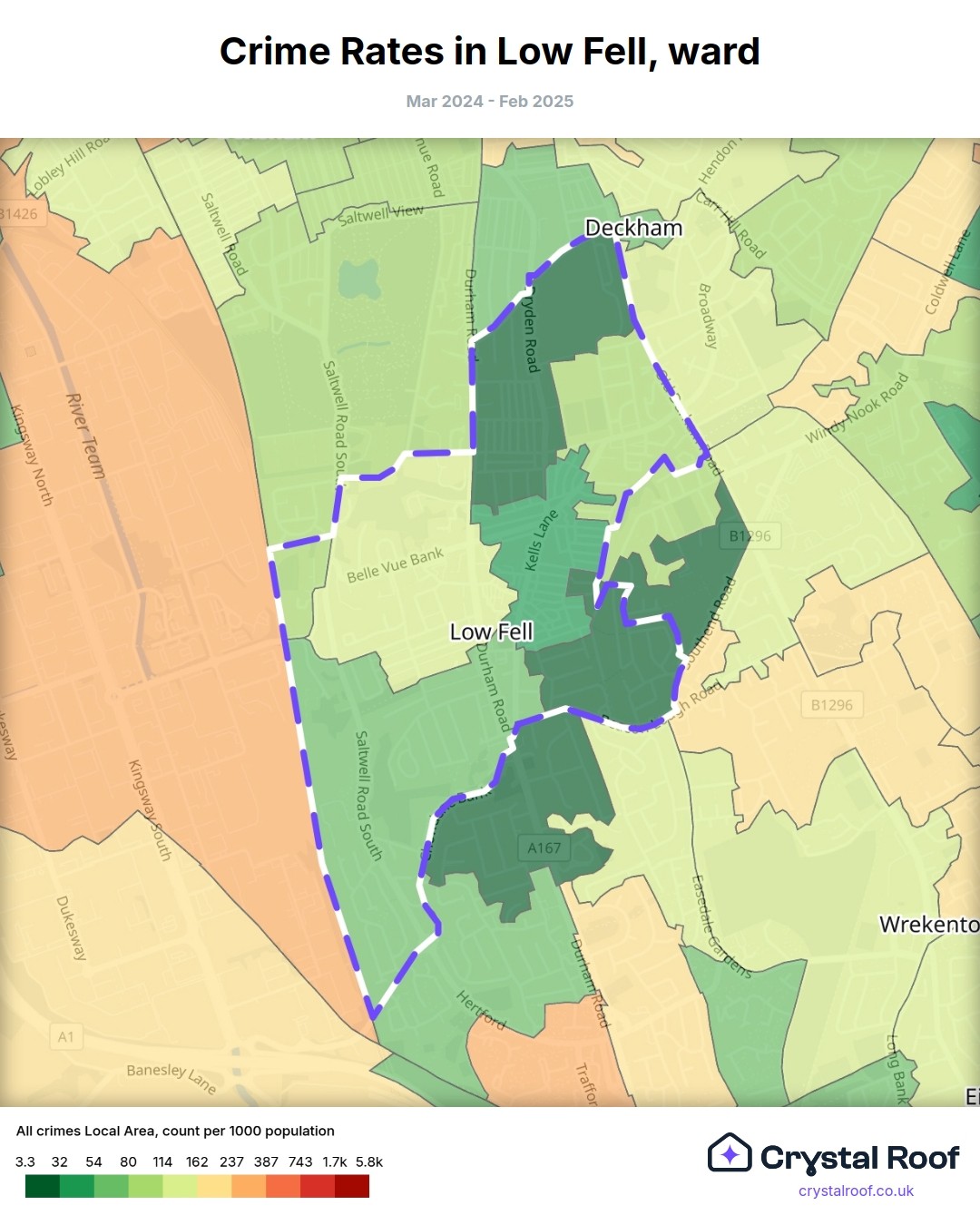 The figures in grey indicate the relative ratings of Low Fell (ward) for a specific crime type compared to other wards in England and Wales.