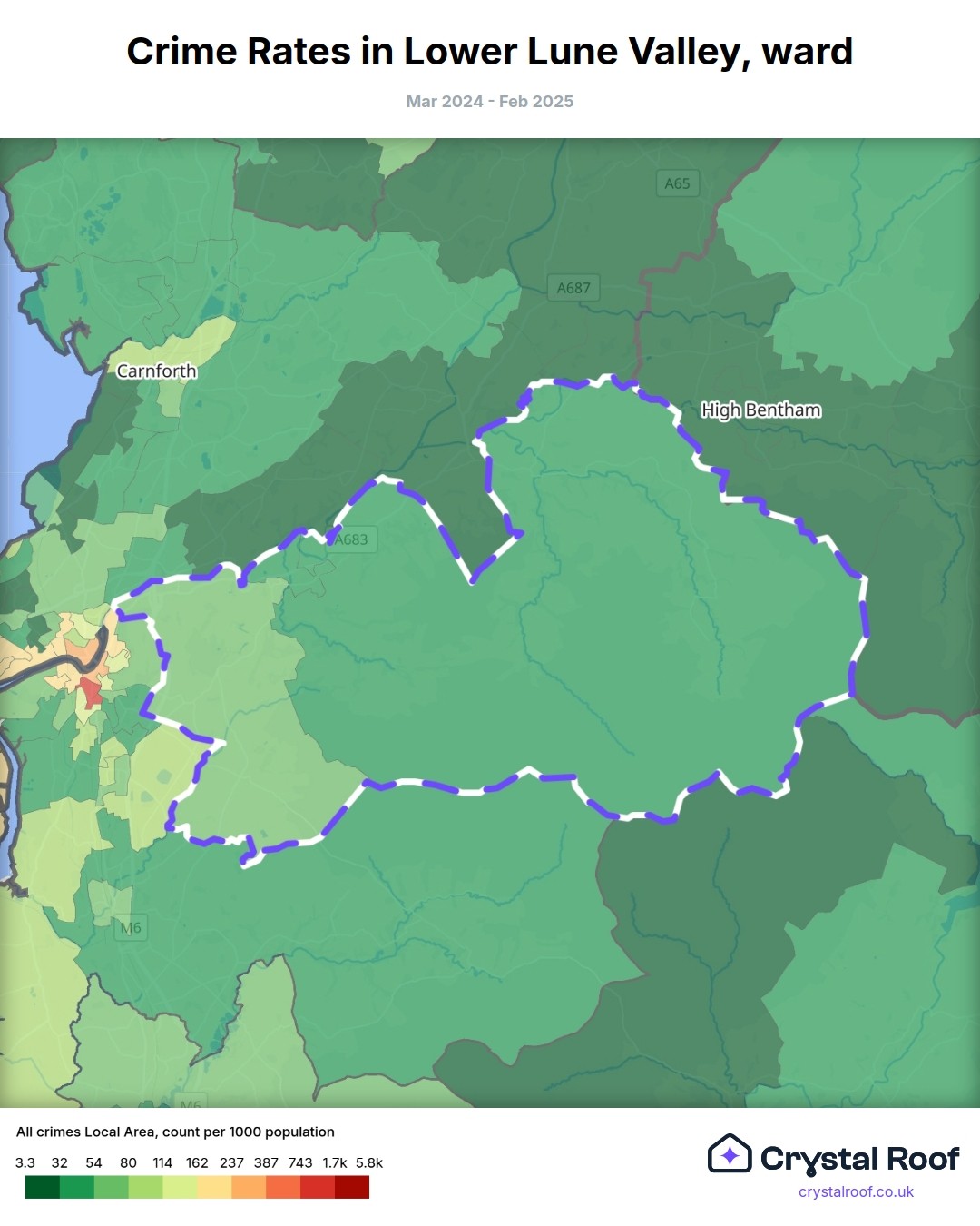 The figures in grey indicate the relative ratings of Lower Lune Valley (ward) for a specific crime type compared to other wards in England and Wales.