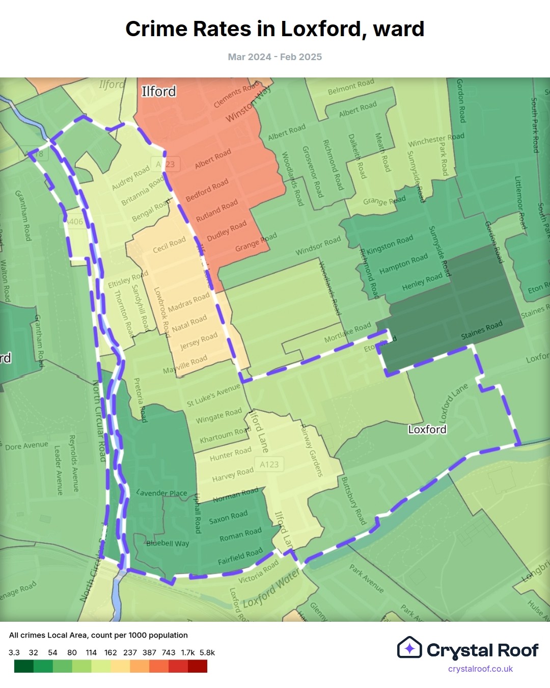 Loxford, (ward) includes areas with the following crime ratings (see map):