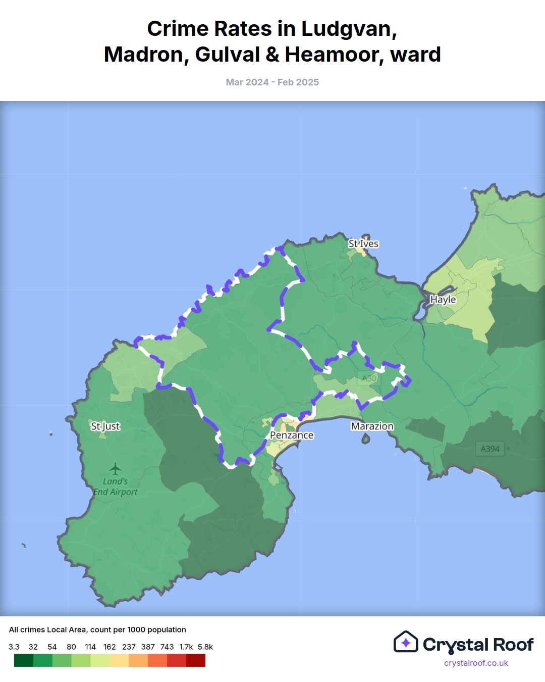 The figures in grey indicate the relative ratings of Ludgvan, Madron, Gulval & Heamoor (ward) for a specific crime type compared to other wards in England and Wales.