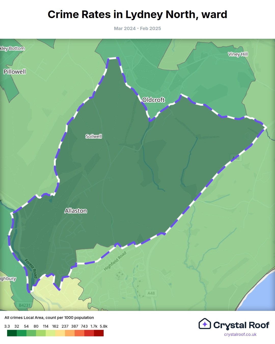 The figures in grey indicate the relative ratings of Lydney North (ward) for a specific crime type compared to other wards in England and Wales.