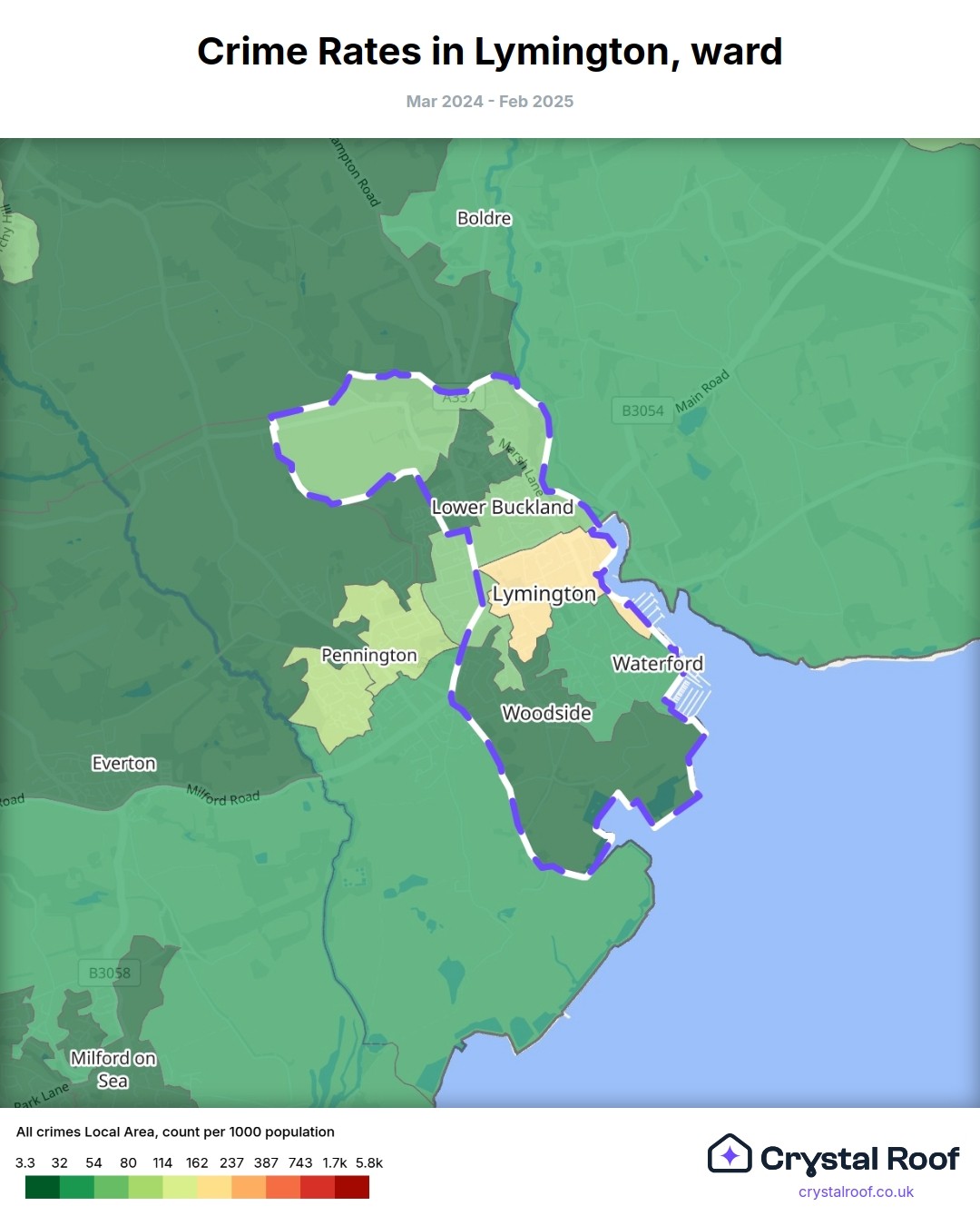 Lymington, (ward) includes areas with the following crime ratings (see map):