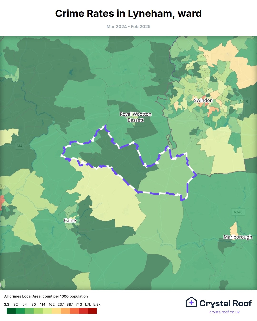 Lyneham (ward) is located within Wiltshire (borough). Annual total crime rate in Wiltshire (borough) is 62.1 crimes per thousand resident population, which can be rated as 2 out of 10 or low crime level compared to other local authority districts in England and Wales.