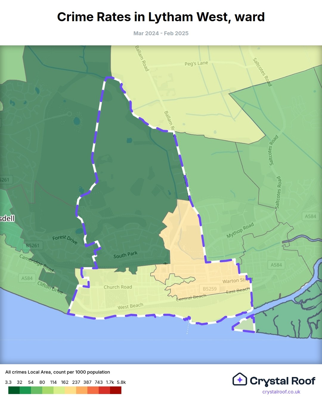 Lytham West, (ward) includes areas with the following crime ratings (see map):