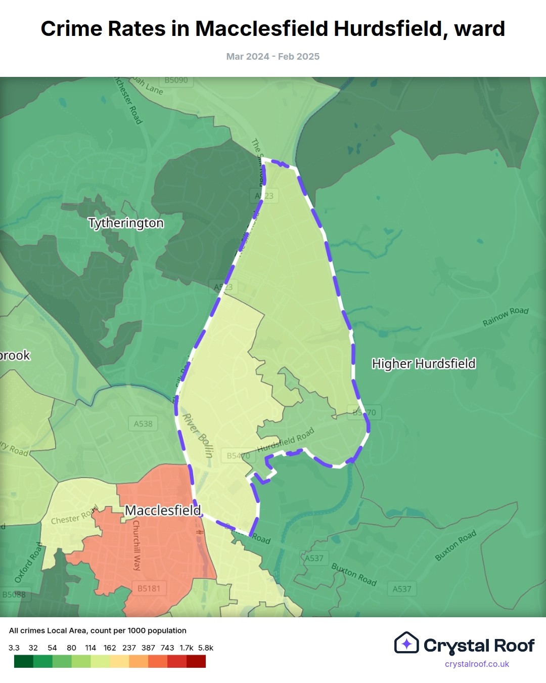 Macclesfield Hurdsfield, (ward) includes areas with the following crime ratings (see map):
