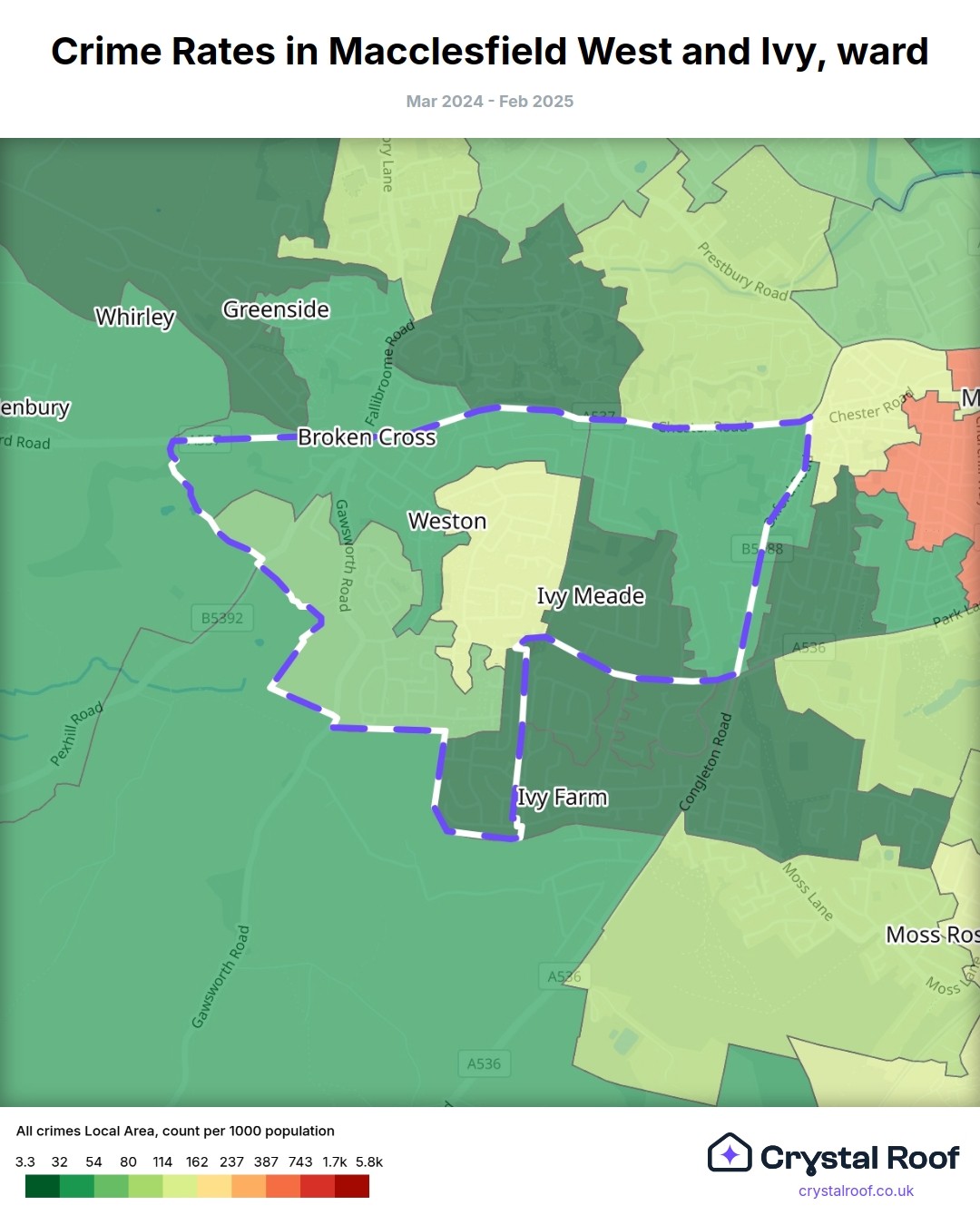 Macclesfield West and Ivy, (ward) includes areas with the following crime ratings (see map):