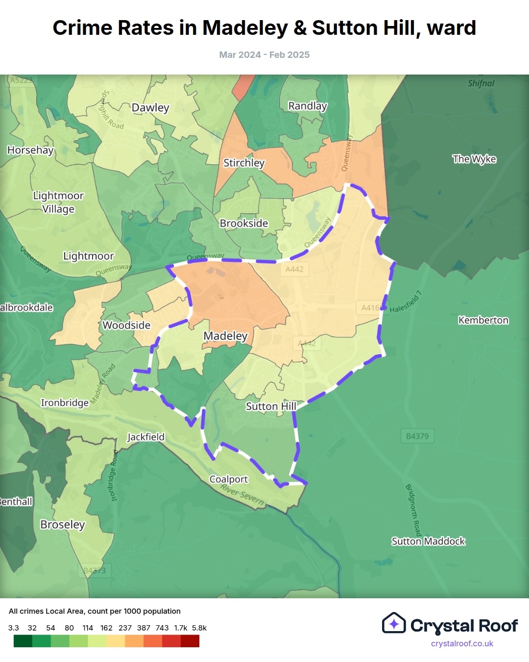 Madeley & Sutton Hill, (ward) includes areas with the following crime ratings (see map):