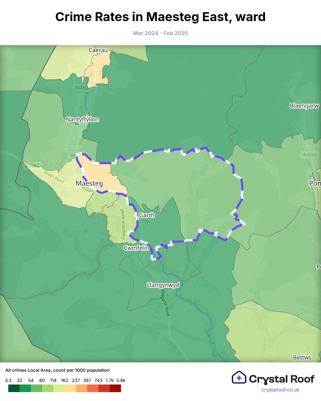 The figures in grey indicate the relative ratings of Maesteg East (ward) for a specific crime type compared to other wards in England and Wales.