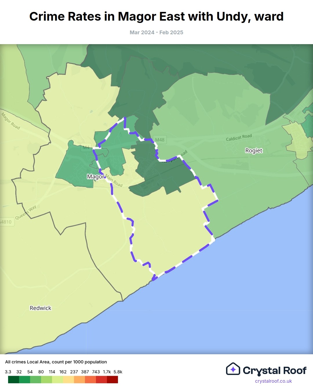 Magor East with Undy, (ward) includes areas with the following crime ratings (see map):