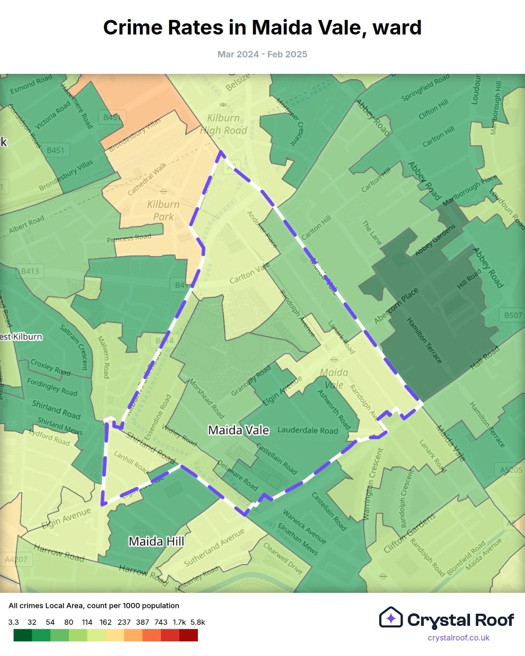 The figures in grey indicate the relative ratings of Maida Vale (ward) for a specific crime type compared to other wards in England and Wales.