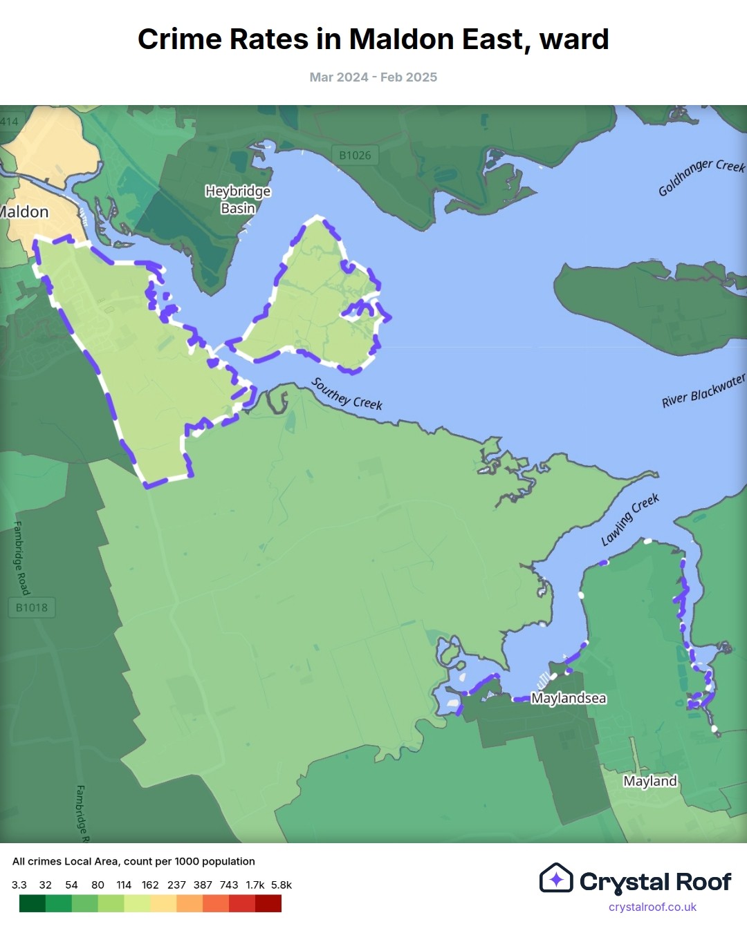 Maldon East, (ward) includes areas with the following crime ratings (see map):