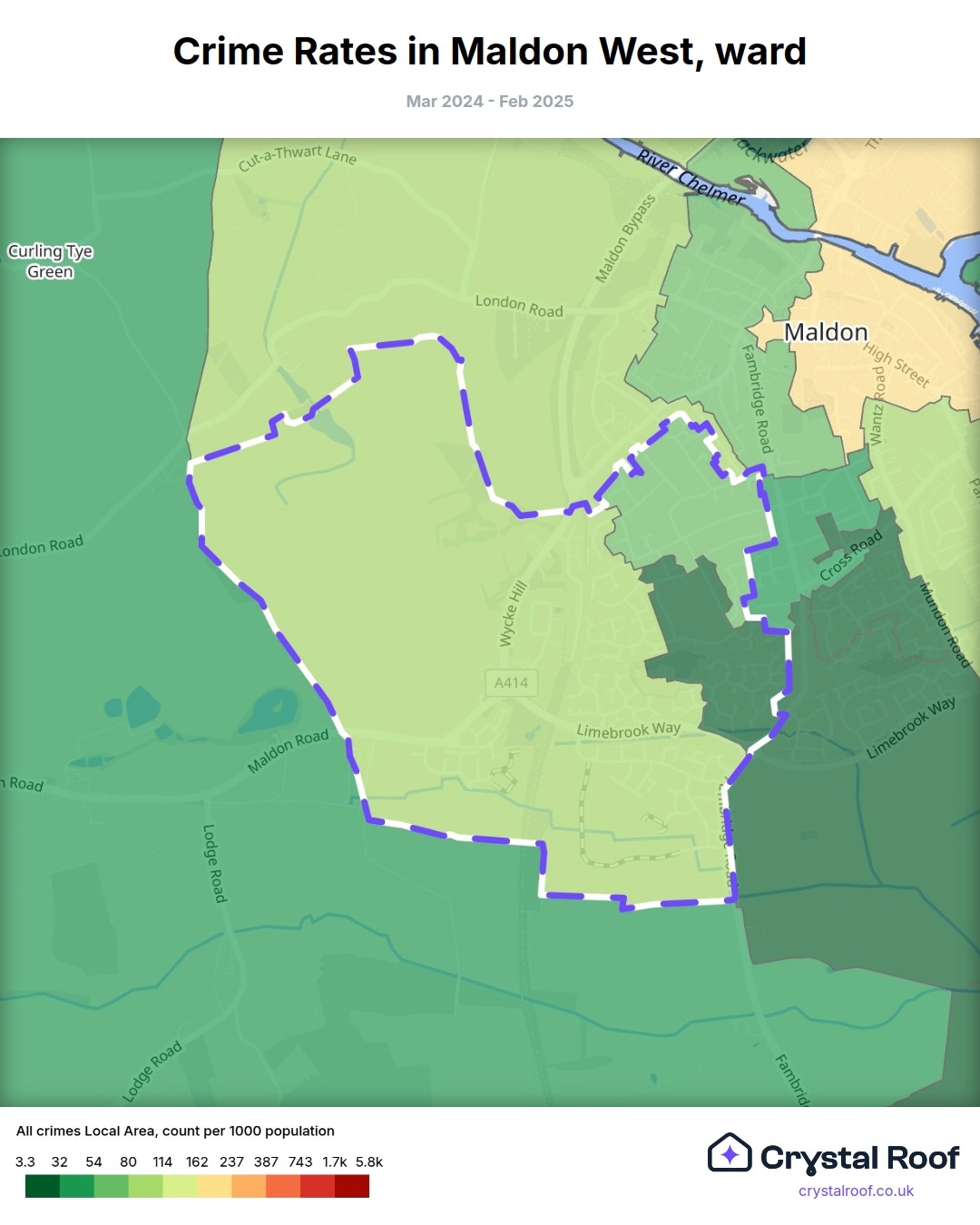 Maldon West, (ward) includes areas with the following crime ratings (see map):