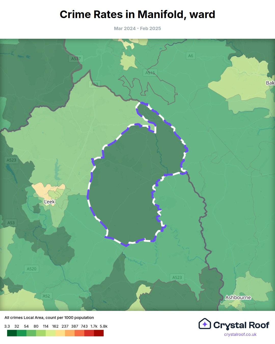Manifold (ward) is located within Staffordshire Moorlands (borough). Annual total crime rate in Staffordshire Moorlands (borough) is 67.1 crimes per thousand resident population, which can be rated as 2 out of 10 or low crime level compared to other local authority districts in England and Wales.