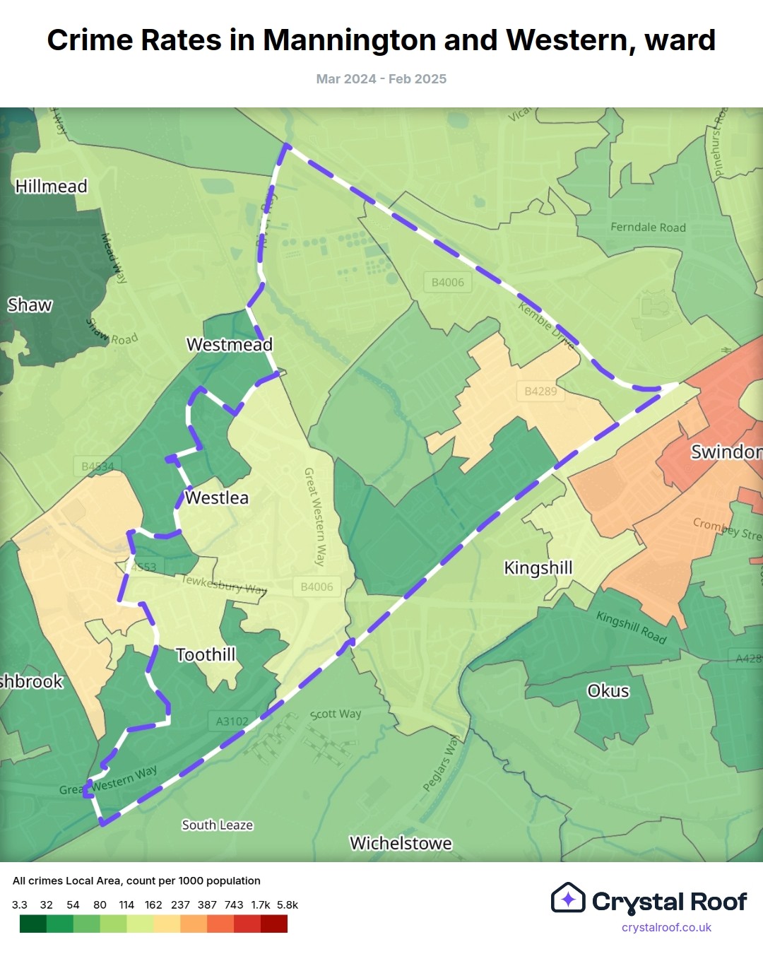 Mannington and Western (ward) is located within Swindon (borough). Annual total crime rate in Swindon (borough) is 86.5 crimes per thousand resident population, which can be rated as 4 out of 10 or low crime level compared to other local authority districts in England and Wales.
