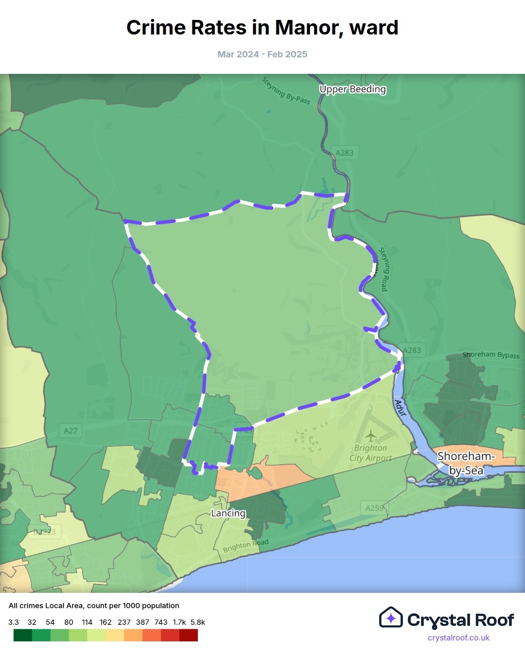 Manor (ward) is located within Adur (borough). Annual total crime rate in Adur (borough) is 69.8 crimes per thousand resident population, which can be rated as 2 out of 10 or low crime level compared to other local authority districts in England and Wales.