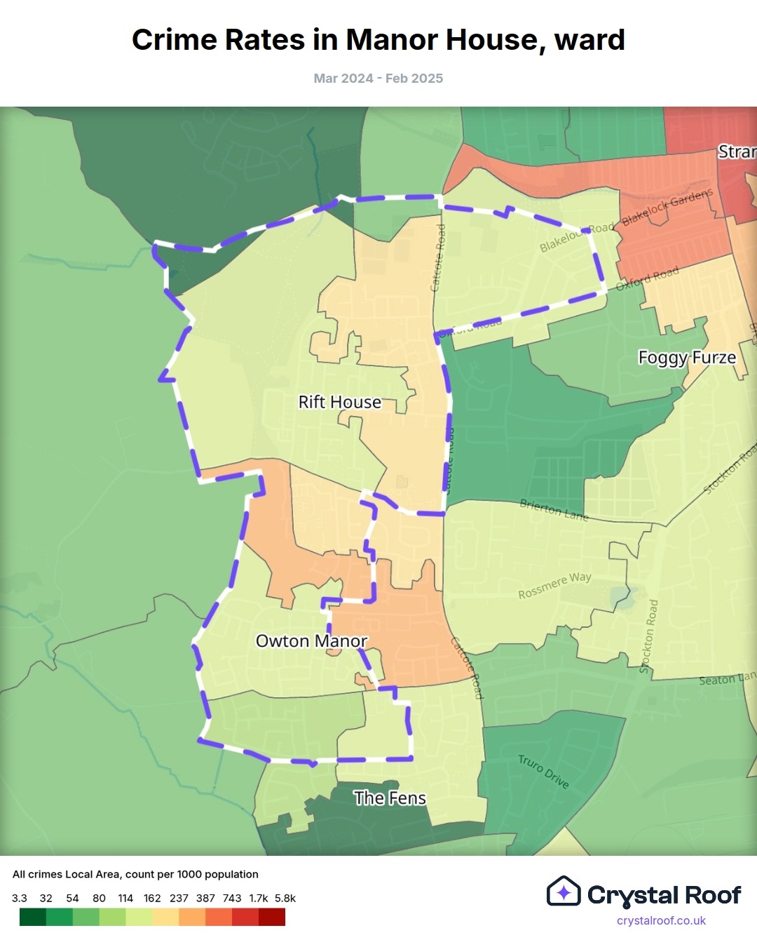 Manor House (ward) is located within Hartlepool (borough). Annual total crime rate in Hartlepool (borough) is 171 crimes per thousand resident population, which can be rated as 8 out of 10 or high crime level compared to other local authority districts in England and Wales.