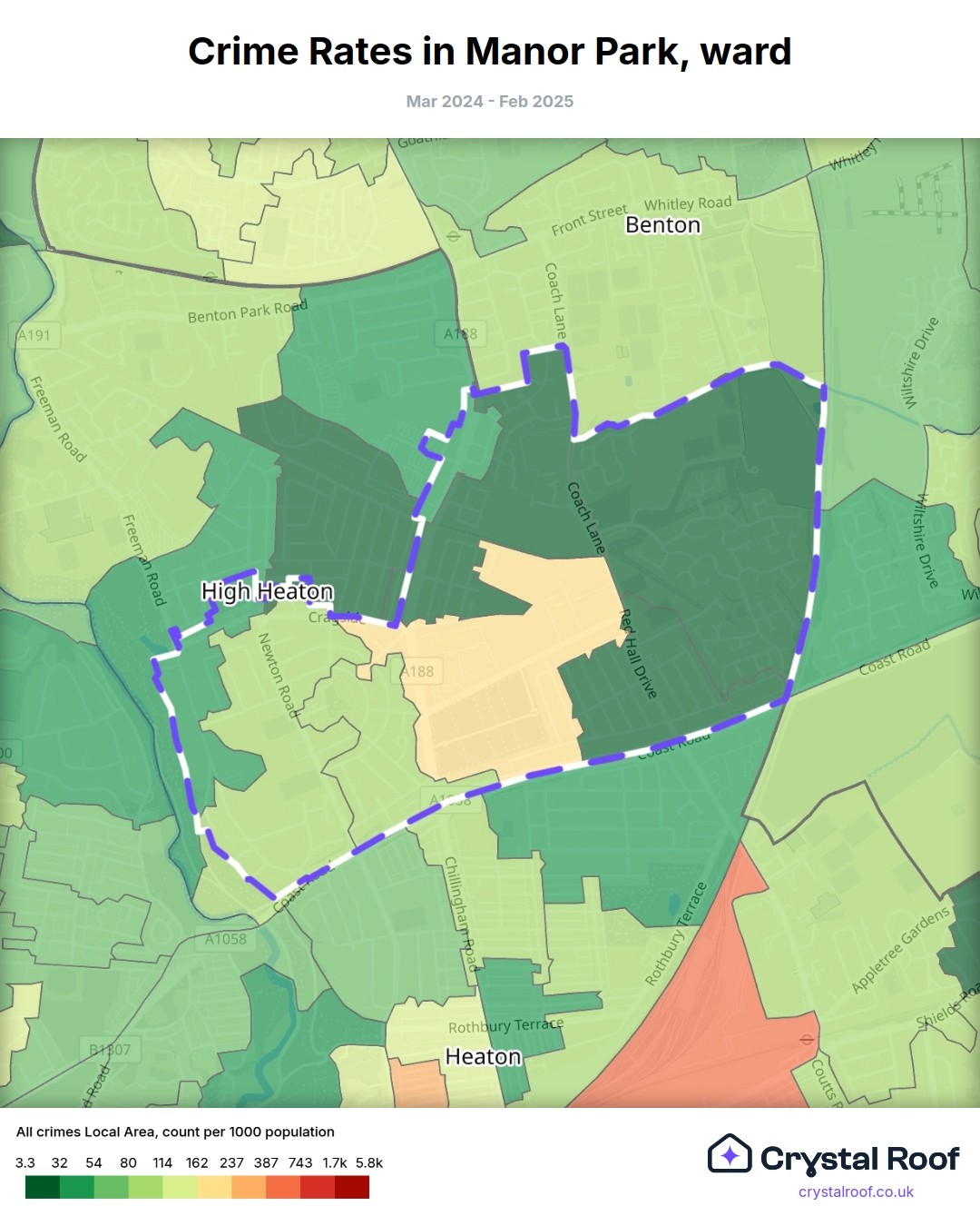 Manor Park (ward) is located within Newcastle upon Tyne (borough). Annual total crime rate in Newcastle upon Tyne (borough) is 148 crimes per thousand resident population, which can be rated as 7 out of 10 or high crime level compared to other local authority districts in England and Wales.