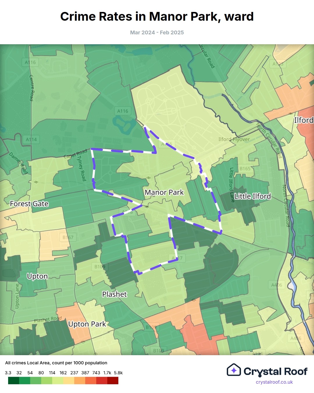 Manor Park, (ward) includes areas with the following crime ratings (see map):