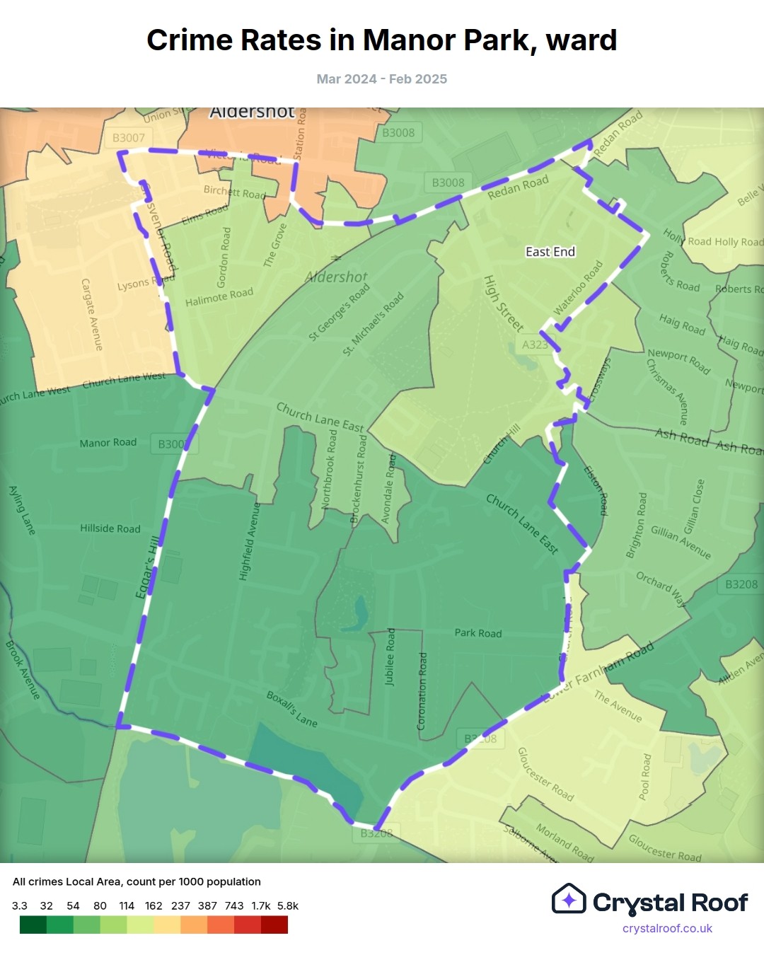 Manor Park (ward) is located within Rushmoor (borough). Annual total crime rate in Rushmoor (borough) is 87.9 crimes per thousand resident population, which can be rated as 4 out of 10 or low crime level compared to other local authority districts in England and Wales.
