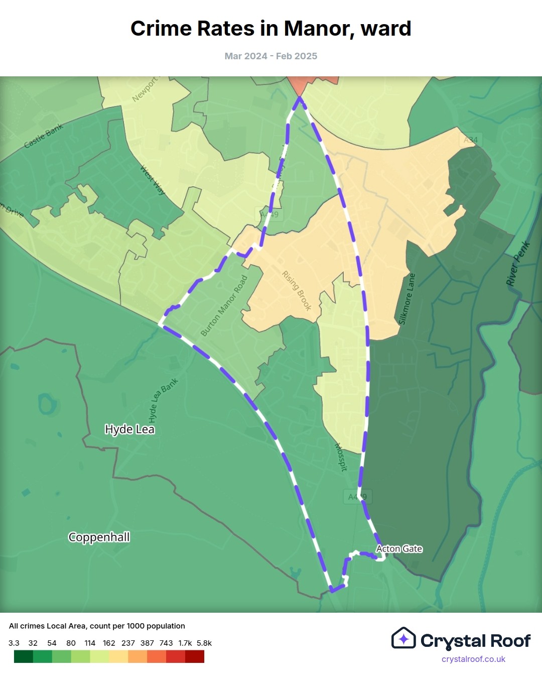 Manor (ward) is located within Stafford (borough). Annual total crime rate in Stafford (borough) is 74.9 crimes per thousand resident population, which can be rated as 3 out of 10 or low crime level compared to other local authority districts in England and Wales.