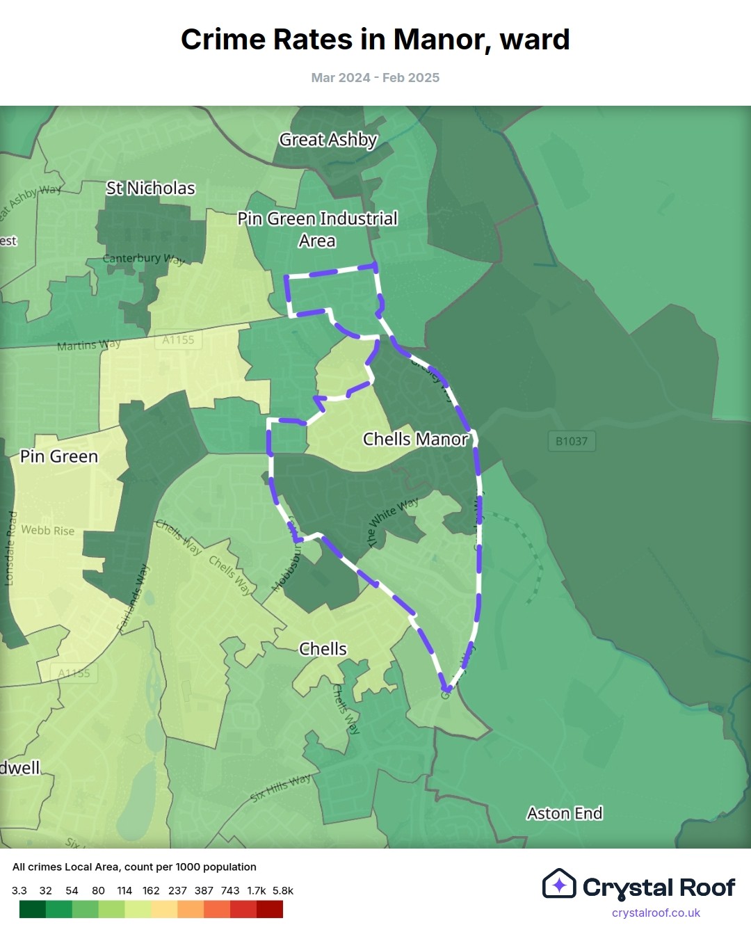 Manor (ward) is located within Stevenage (borough). Annual total crime rate in Stevenage (borough) is 111 crimes per thousand resident population, which can be rated as 5 out of 10 or medium crime level compared to other local authority districts in England and Wales.