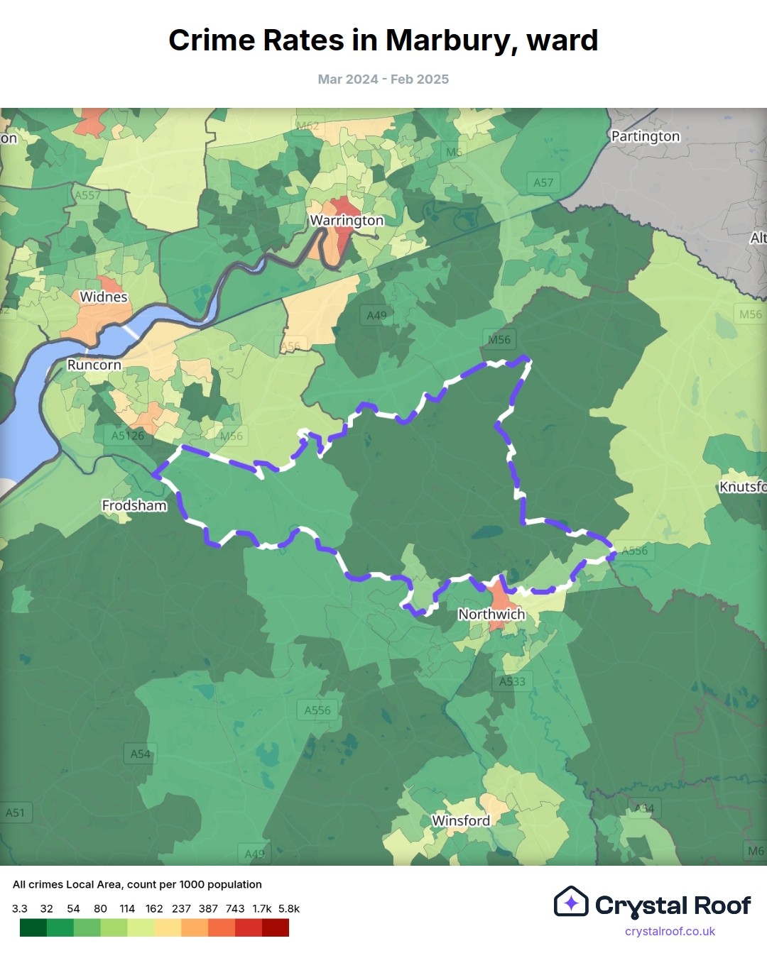 Marbury (ward) is located within Cheshire West and Chester (borough). Annual total crime rate in Cheshire West and Chester (borough) is 69.3 crimes per thousand resident population, which can be rated as 2 out of 10 or low crime level compared to other local authority districts in England and Wales.
