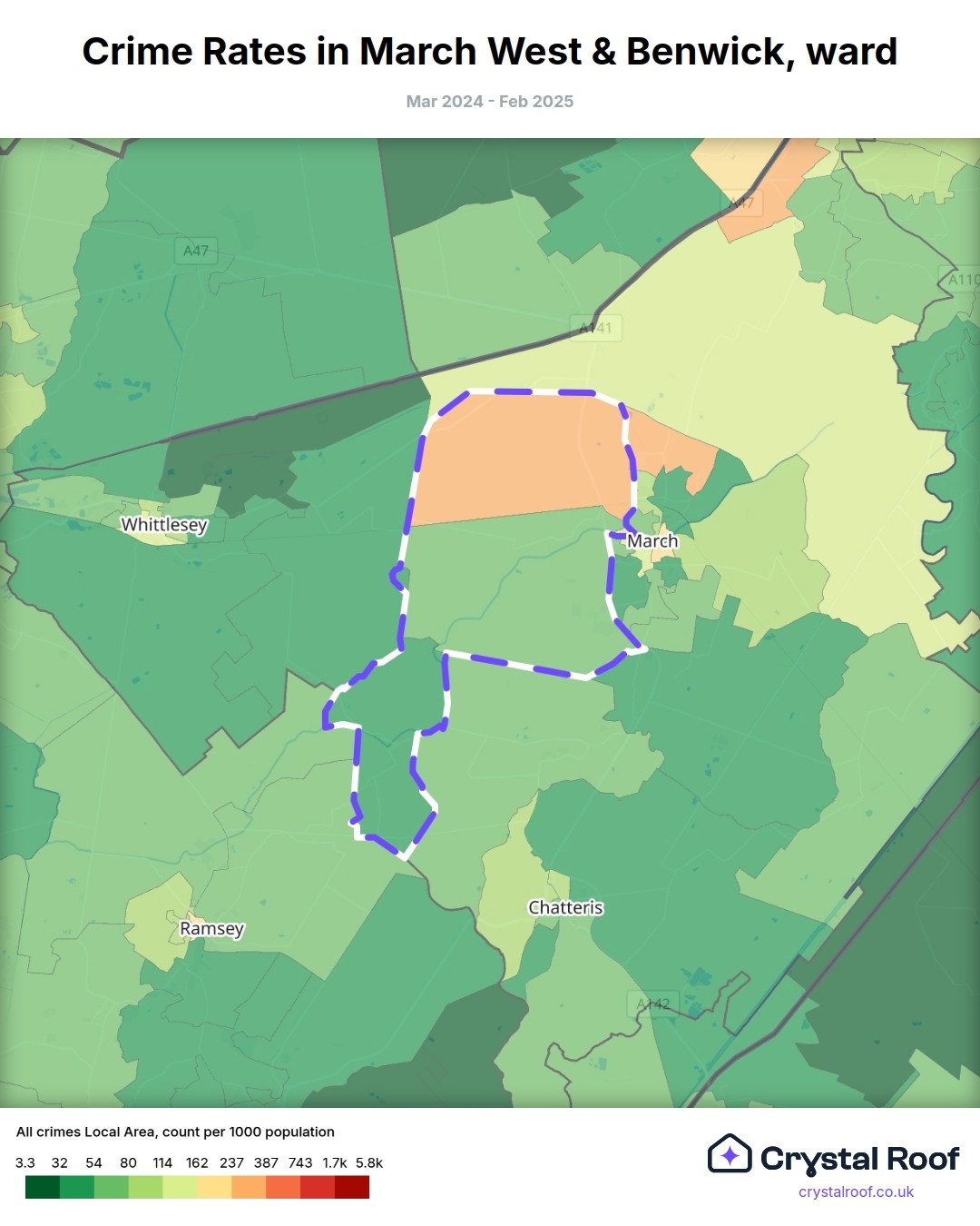 The figures in grey indicate the relative ratings of March West & Benwick (ward) for a specific crime type compared to other wards in England and Wales.