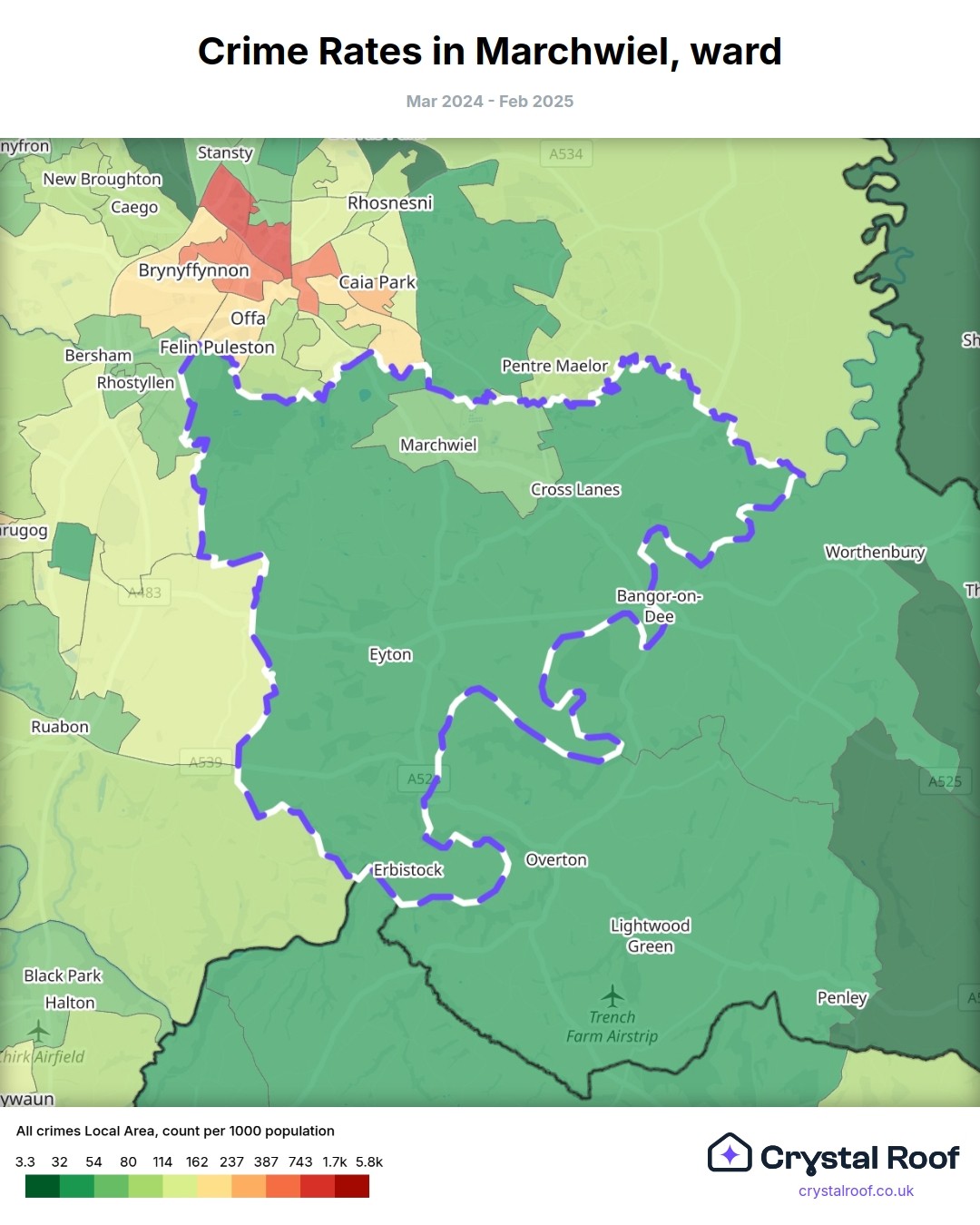 Marchwiel, (ward) includes areas with the following crime ratings (see map):