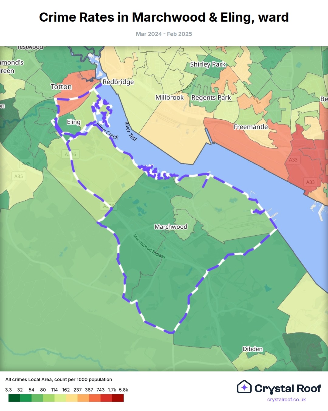 Marchwood & Eling, (ward) includes areas with the following crime ratings (see map):