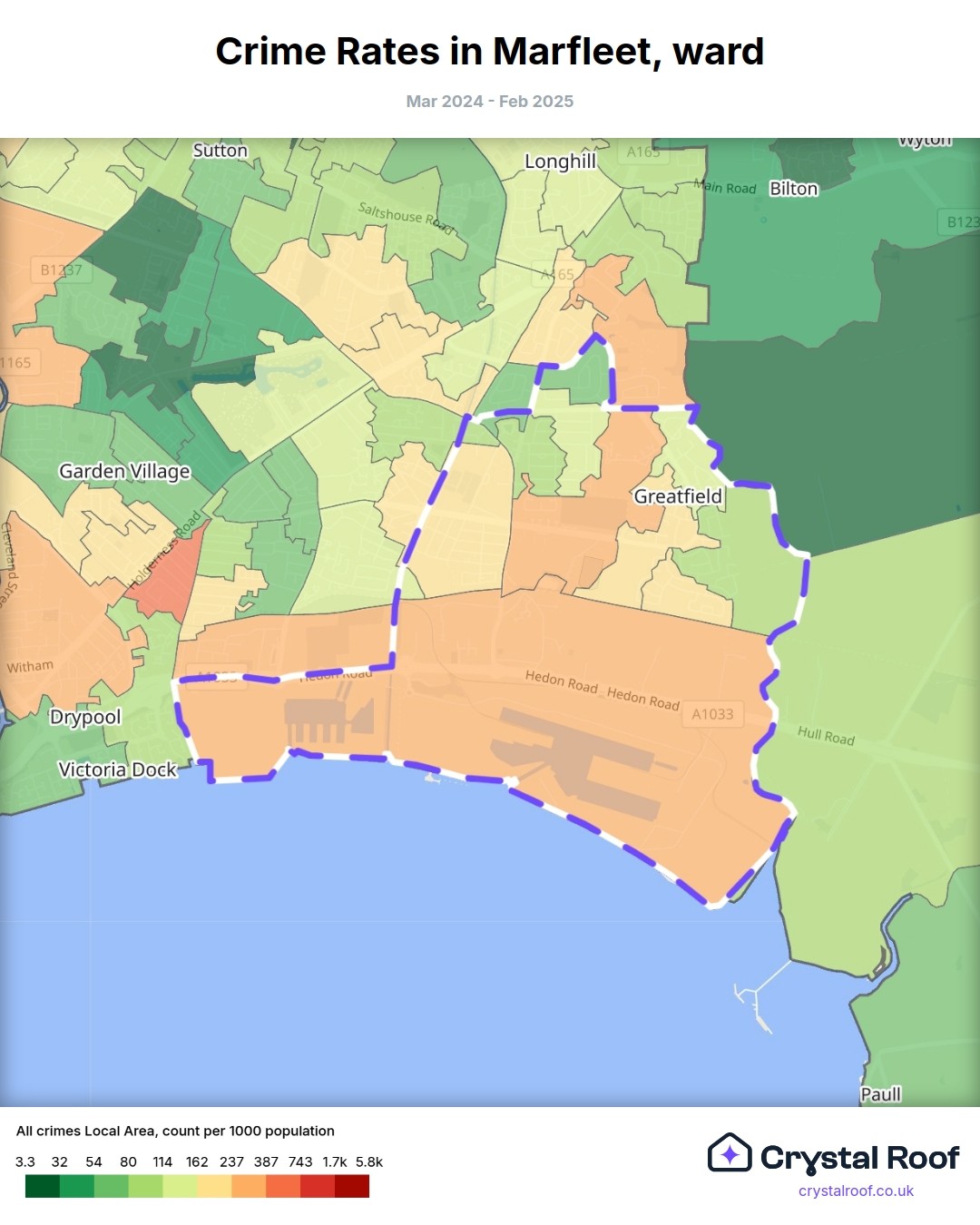 Marfleet, (ward) includes areas with the following crime ratings (see map):