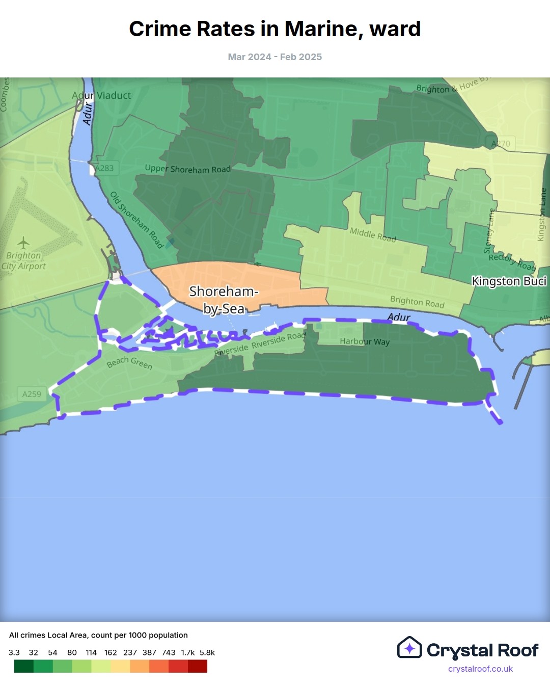 Marine (ward) is located within Adur (borough). Annual total crime rate in Adur (borough) is 69.8 crimes per thousand resident population, which can be rated as 2 out of 10 or low crime level compared to other local authority districts in England and Wales.