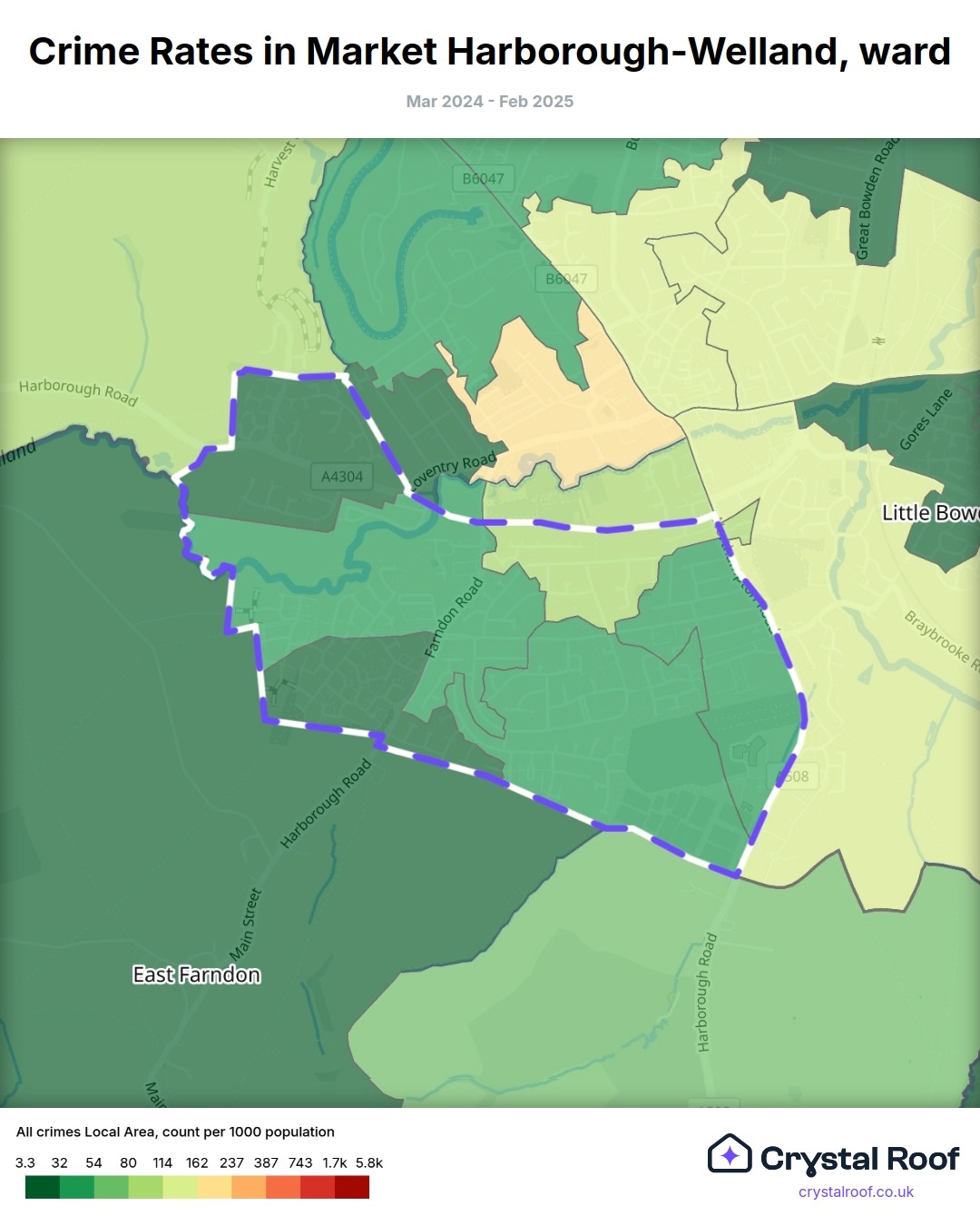 Market Harborough-Welland, (ward) includes areas with the following crime ratings (see map):