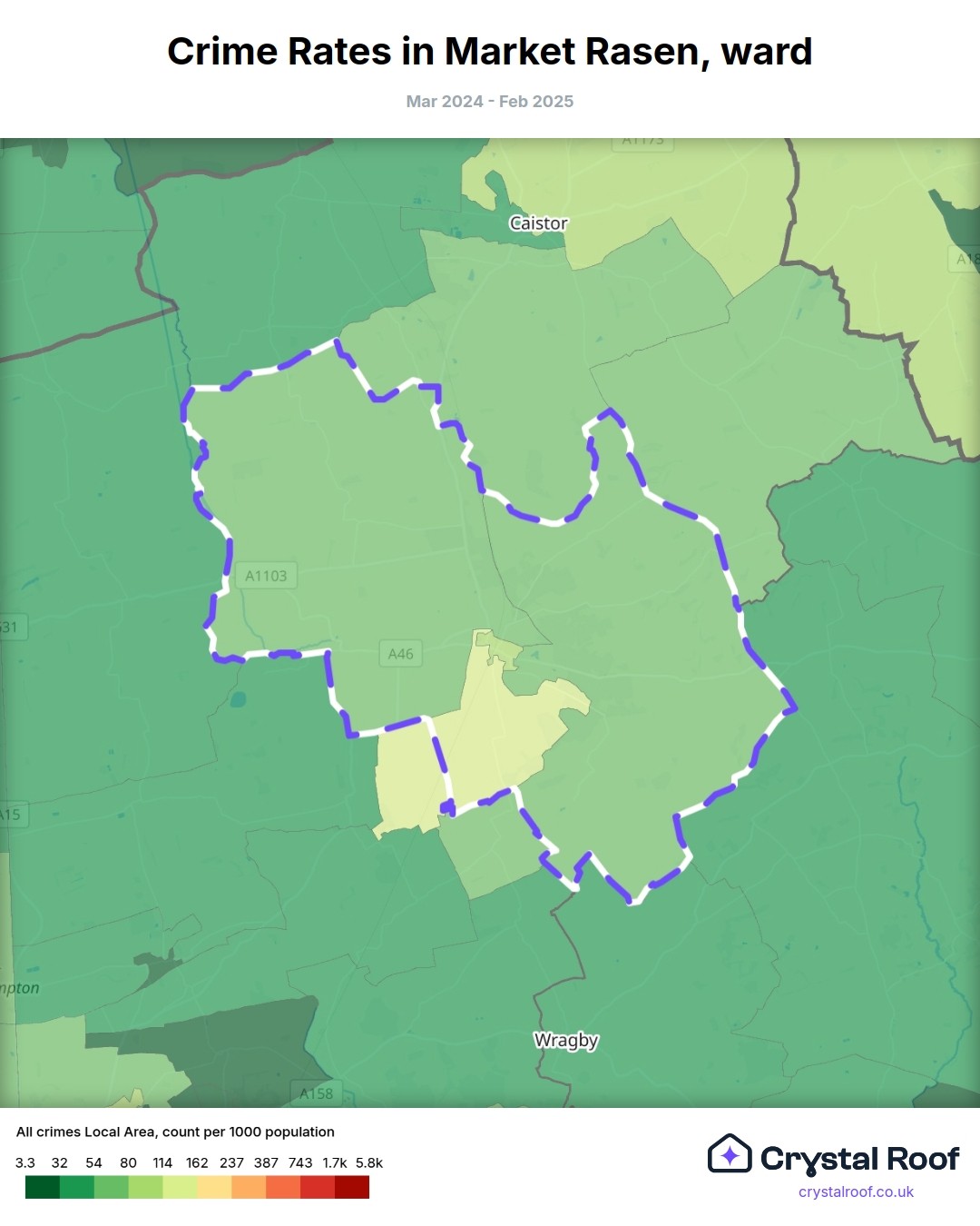 Market Rasen, (ward) includes areas with the following crime ratings (see map):