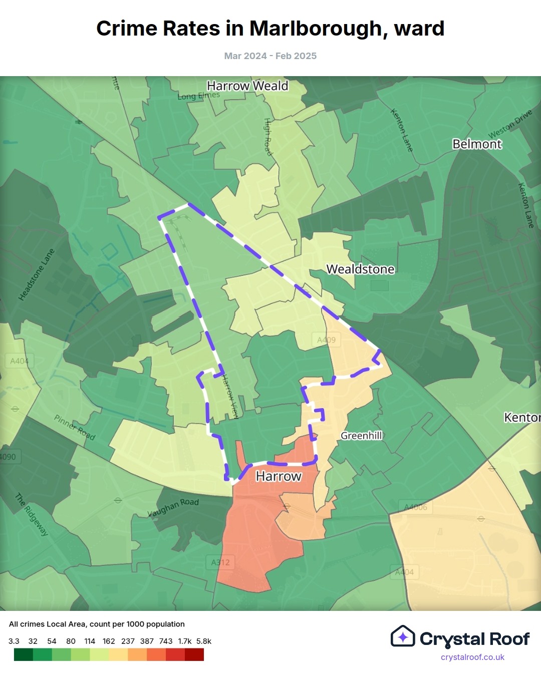 Marlborough (ward) is located within Harrow (borough). Annual total crime rate in Harrow (borough) is 83.3 crimes per thousand resident population, which can be rated as 3 out of 10 or low crime level compared to other local authority districts in England and Wales.