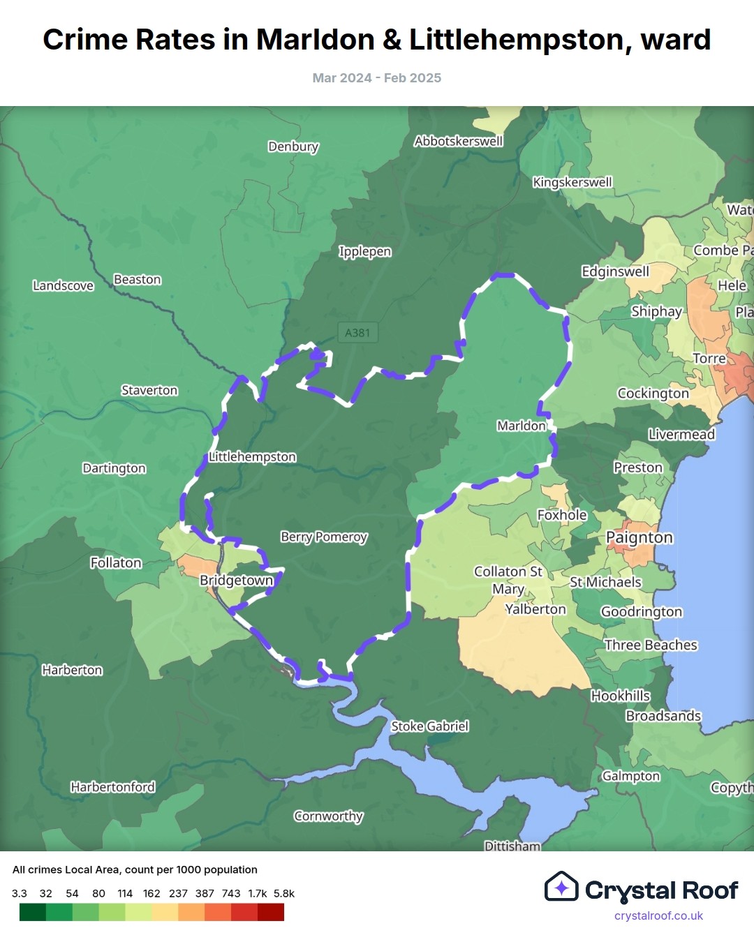 Marldon & Littlehempston, (ward) includes areas with the following crime ratings (see map):