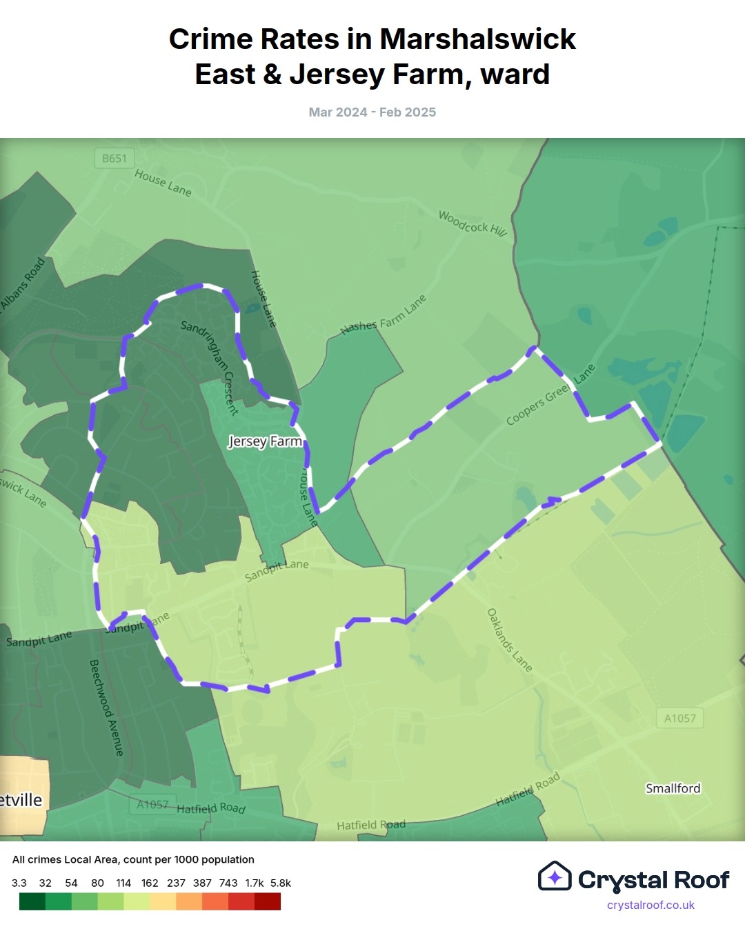 Marshalswick East & Jersey Farm, (ward) includes areas with the following crime ratings (see map):