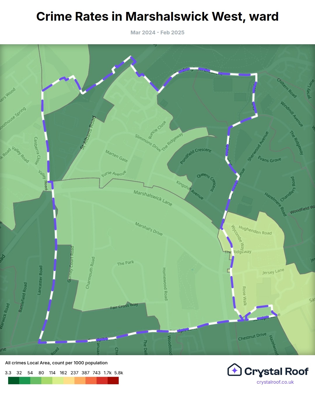 Marshalswick West, (ward) includes areas with the following crime ratings (see map):