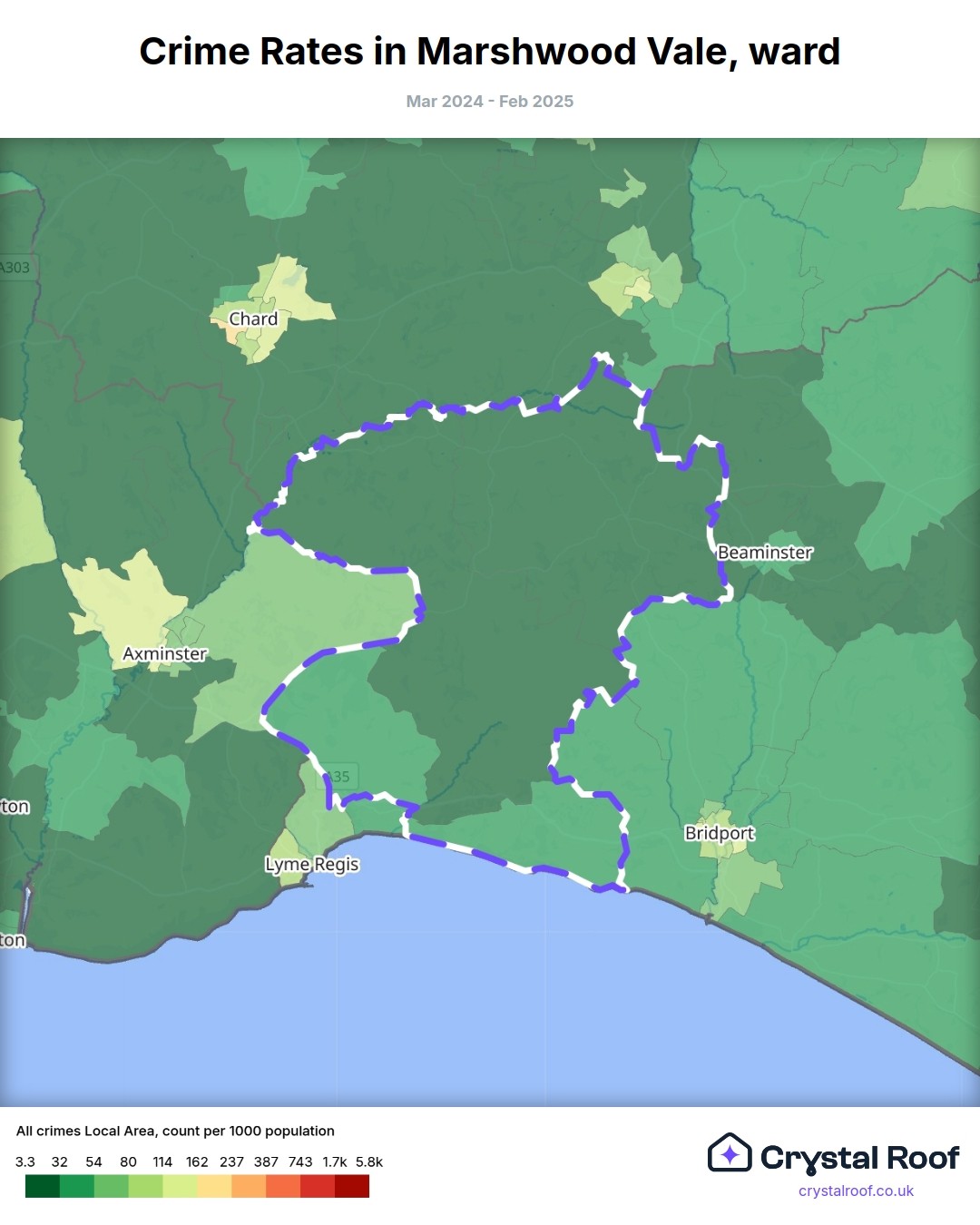 Marshwood Vale, (ward) includes areas with the following crime ratings (see map):